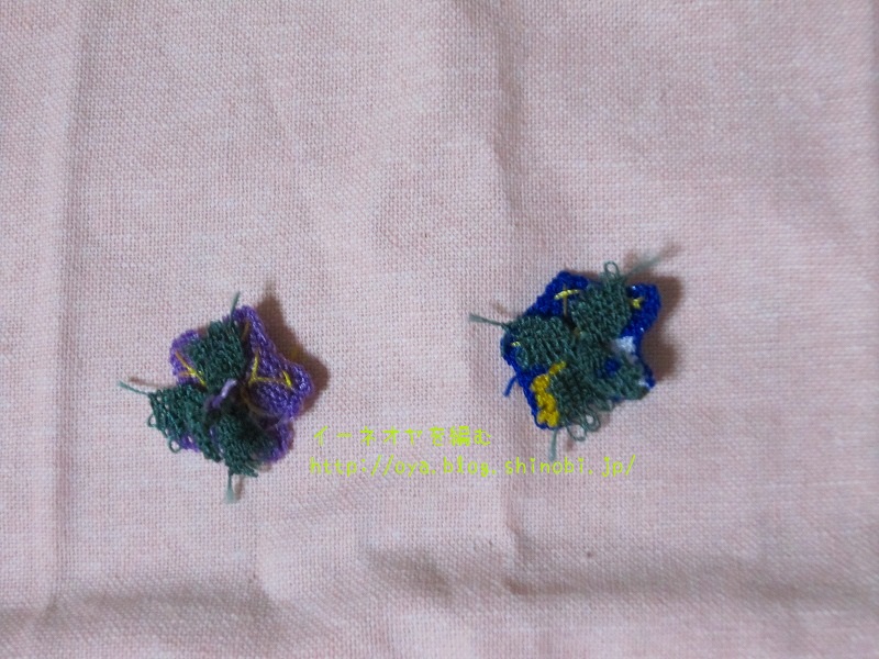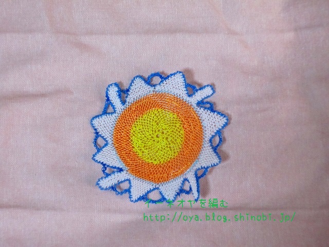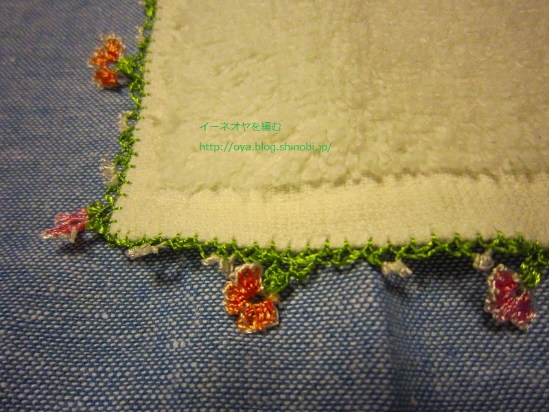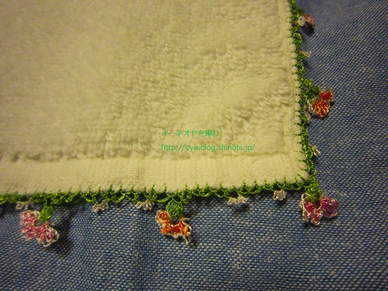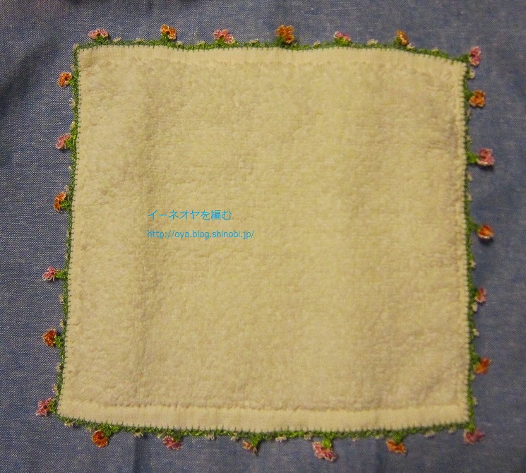 昨日に引き続き、イーネオヤ・トゥーオヤ (レディブティックシリーズno.4077)から、さくら草のモチーフのスカーフを少し変えて、ハンドタオルにモチーフを編んでみました。