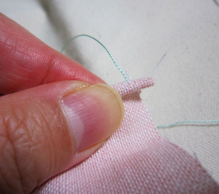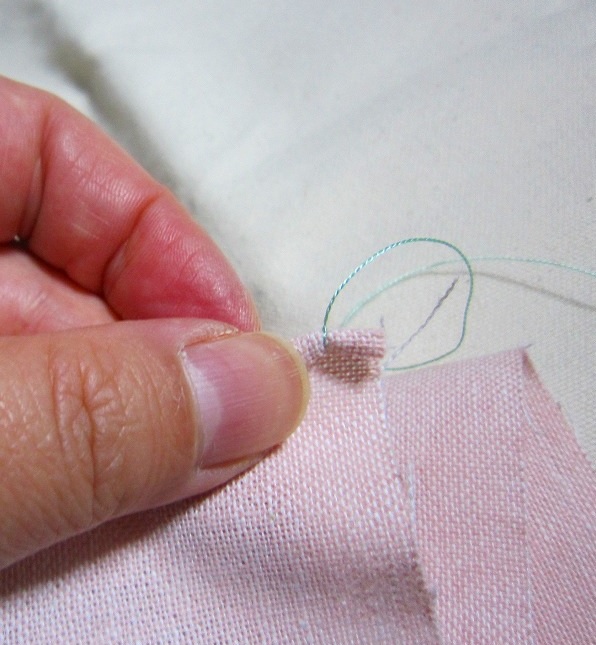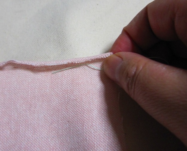布の端を丸めて中に糸を巻き込んだら、丸めた部分に針を入れないように気をつけて、針を入れます。丸まった部分と真っ直ぐな部分の間に刺す感じです。