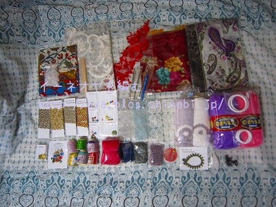 チャームやベネチアングラス、ビーズ、機械織りレース、スカーフ素材、裁縫用具、毛糸などなど。